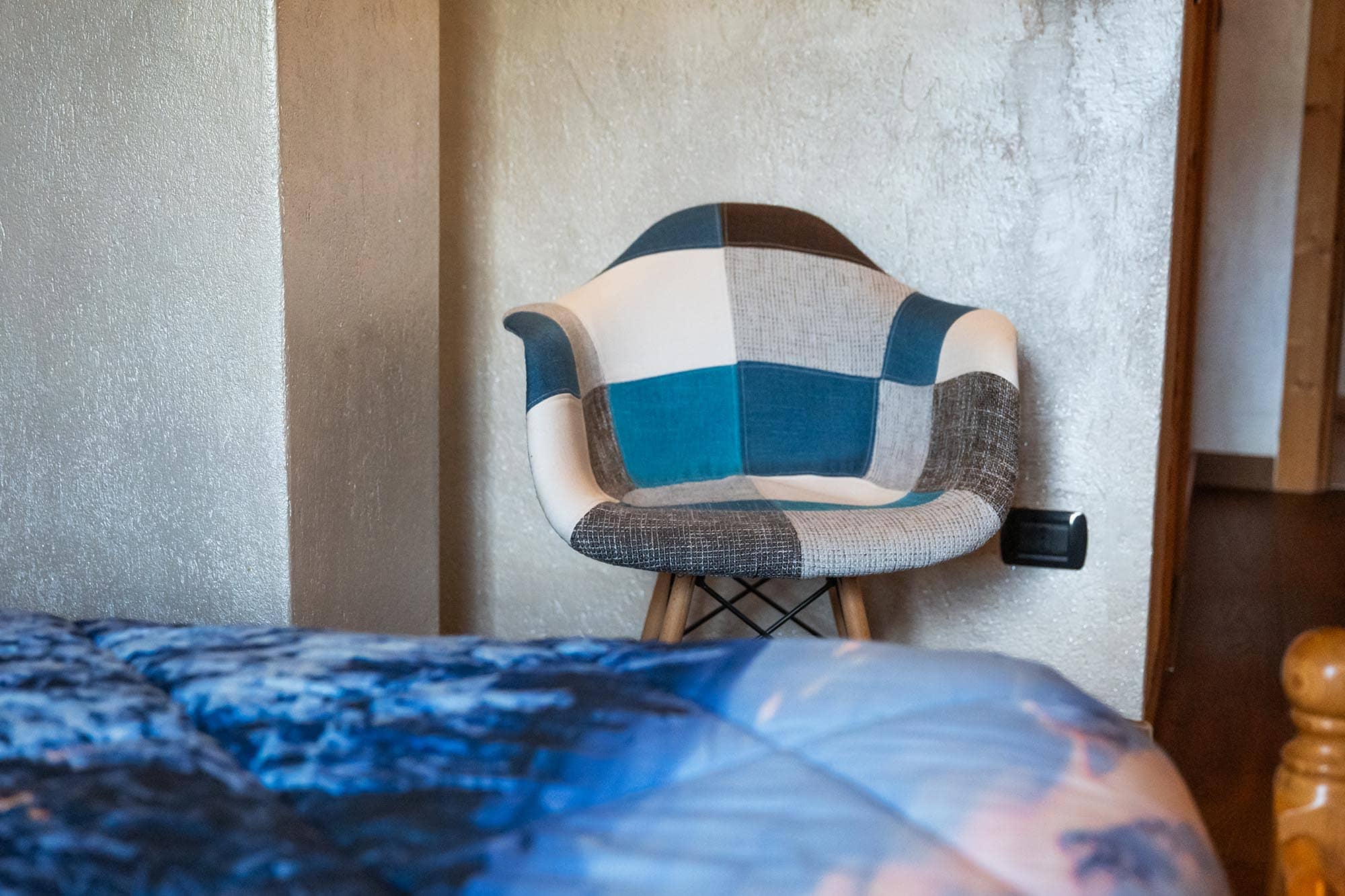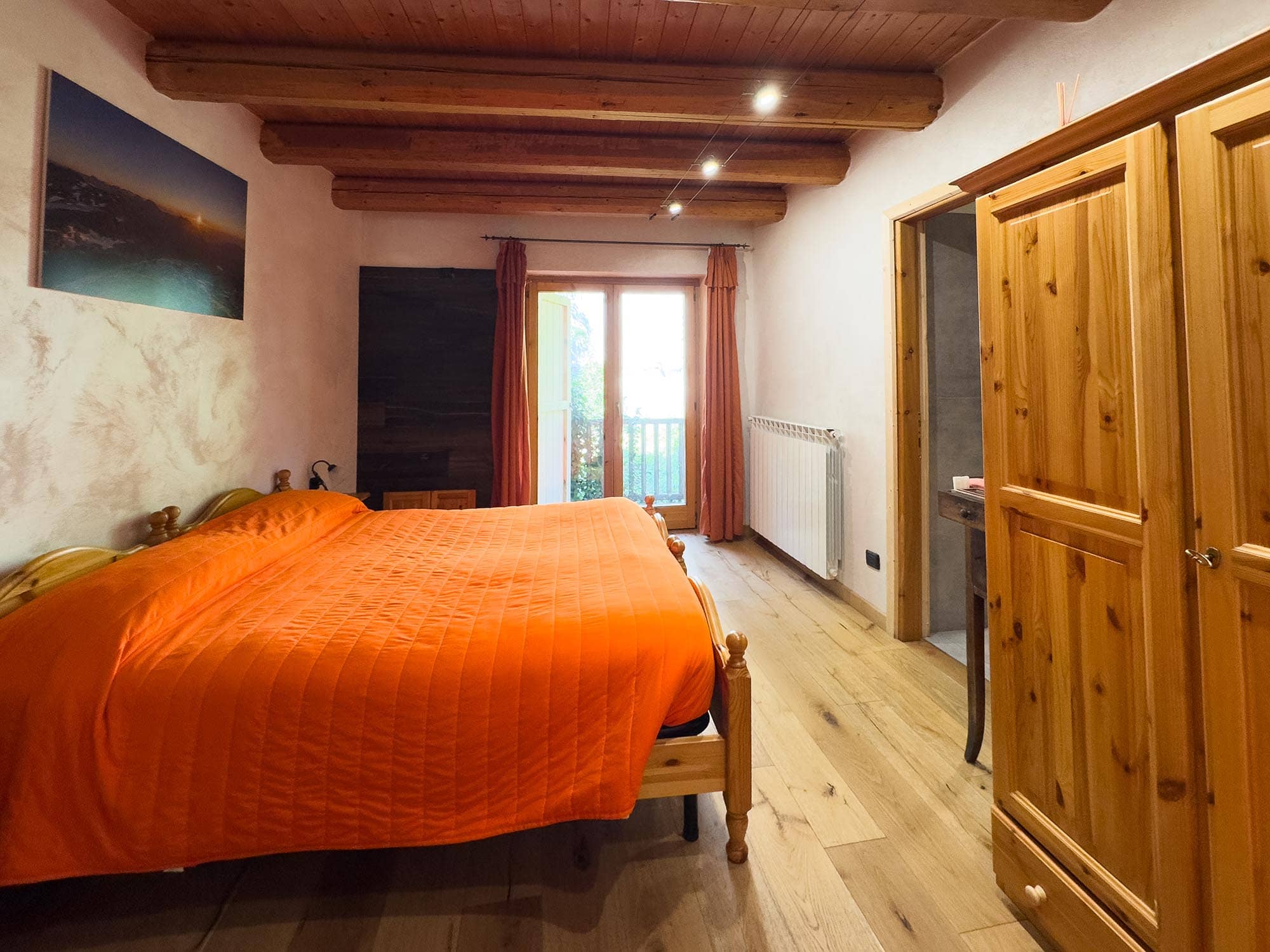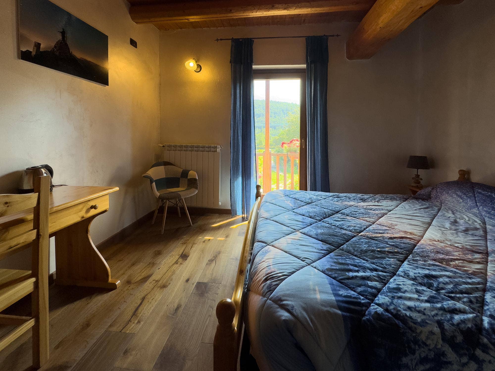 Le camera dell’agriturimo Al Pra di Muriet sono in stile rustico, caratterizzato da travi a vista, arredamento montano e servizi igienici in camera.